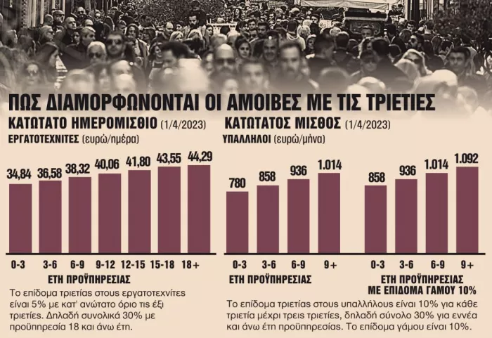 Το ξεπάγωμα των τριετιών θα οδηγούσε σε προσαύξηση μισθού κατά 30% για τους εργαζομένους που έχουν την απαραίτητη προϋπηρεσία (τρεις τριετίες) στον ιδιωτικό τομέα. Σήμερα τα ποσοστά των τριετιών λαμβάνουν μόνο οι εργαζόμενοι που είχαν συμπληρώσει την απαραίτητη προϋπηρεσία (μία, δύο ή τρεις τριετίες) μέχρι τον Φεβρουάριο του 2012.