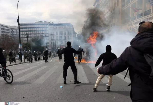 Επεισόδια ξέσπασαν στην πλατεία Συντάγματος, όπου έφτασε η πορεία που πραγματοποιείται σήμερα Πέμπτη για το τραγικό σιδηροδρομικό δυστύχημα στα Τέμπη που στοίχησε τη ζωή σε τουλάχιστον 57 ανθρώπους.