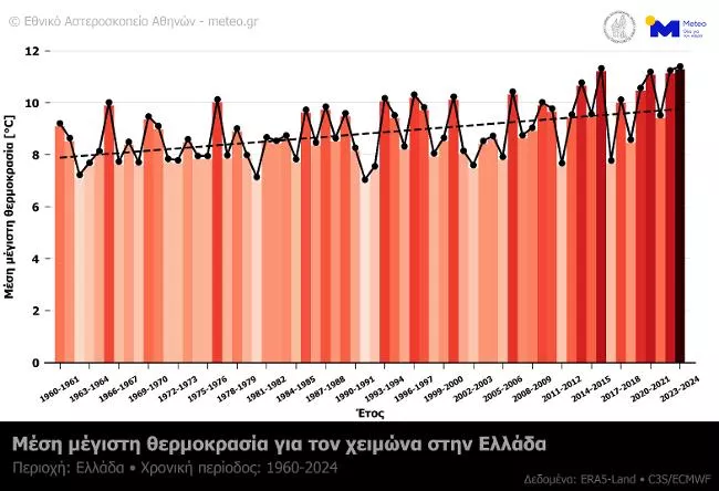 Η μέση μέγιστη θερμοκρασία στην Ελλάδα από το 1960 μέχρι και το 2024 για την περίοδο του χειμώνα παρουσιάζει άνοδο κατά 1.8 °C.