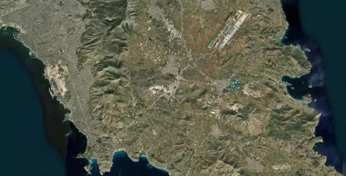 Όπως φαίνεται και στην φωτογραφία οι έξι σεισμοί σημειώθηκαν στο ίδιο σημείο, το οποίο βρίσκεται κοντά στον Διεθνή Αερολιμένα Αθηνών «Ελευθέριος Βενιζέλος».
