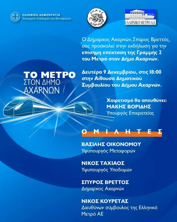 Η παρουσίαση θα πραγματοποιηθεί στην Αίθουσα Δημοτικού Συμβουλίου του Δήμου Αχαρνών, ενώ ομιλητές θα είναι ο υφυπουργός Μεταφορών, κ. Βασίλης Οικονόμου, υφυπουργός Υποδομών, κ. Νίκος Ταχιάος, ο Δήμαρχος Αχαρνών, κ. Σπύρος Βρεττός και ο Διευθύνων Σύμβουλος της Ελληνικό Μετρό, κ. Νίκος Κουρέτας.