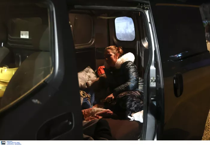 Κάποιοι ήδη εξαντλημένοι κοιμούνται μέσα στα αμάξια.