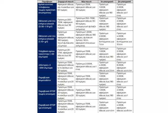 Χωρίς την πρόκληση ατυχήματος, η πρώτη παράβαση συνοδεύεται από πρόστιμο 350 ευρώ και αφαίρεση άδειας για 30 ημέρες. Για όσους επαναλάβουν την παράβαση το πρόστιμο «σκαρφαλώνει» στα 1.000 ευρώ και η απώλεια του διπλώματος επεκτείνεται στις 180 ημέρες. Η δεύτερη υποτροπή σημαίνει 2.000 ευρώ πρόστιμο.