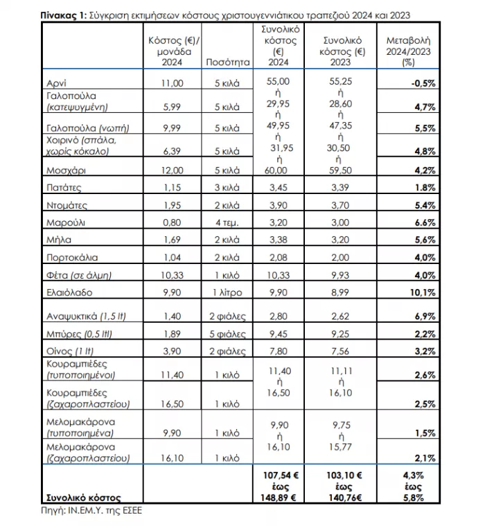 Σημειώνεται, τέλος, πως το ΙΝ.ΕΜ.Υ. της ΕΣΕΕ πραγματοποίησε, κατά το διάστημα 18 - 19 Δεκεμβρίου 2024, ενδεικτική καταγραφή των τιμών πώλησης των προϊόντων του χριστουγεννιάτικου τραπεζιού, με τη μέθοδο της επιτόπιας παρατήρησης σε εμπορικές αγορές της Αττικής και διαμέσου τηλεφωνικής συνέντευξης για τη Θεσσαλονίκη.