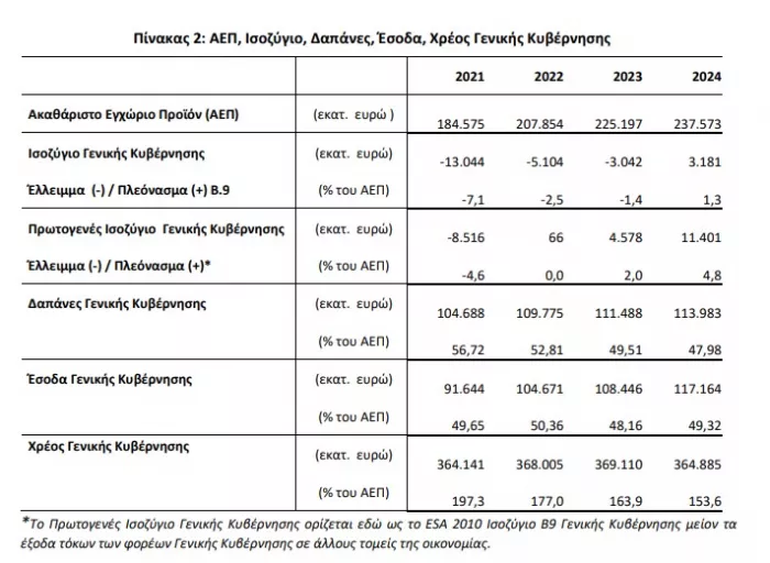 Ο παρακάτω πίνακας παρουσιάζει την εξέλιξη του ΑΕΠ, του ισοζυγίου Γενικής Κυβέρνησης, του πρωτογενούς ισοζυγίου Γενικής Κυβέρνησης, των δαπανών (σε ενοποιημένη βάση), των εσόδων (σε ενοποιημένη βάση) και του χρέους Γενικής Κυβέρνησης (σε ενοποιημένη βάση) την περίοδο 2021-2024, όπως υπολογίζονται σύμφωνα με το ESA 2010.