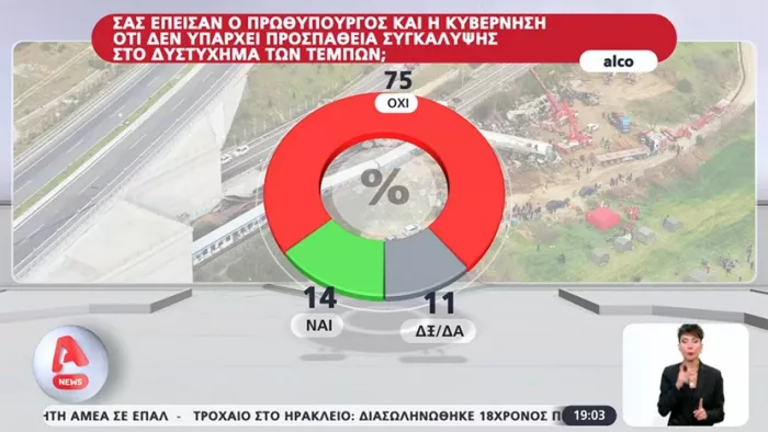 Αξίζει να σημειωθεί ότι «αγκάθι» για την κυβέρνηση αποτελεί η υπόθεση των Τεμπών, καθώς το 75% απάντησε όχι στο ερώτημα αν «σας έπεισε ο Πρωθυπουργός και η κυβέρνηση ότι δεν υπάρχει προσπάθεια συγκάλυψης στο δυστύχημα των Τεμπών».